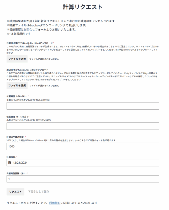 - 計算リクエストフォームより.obj / .fbxファイルアップ ロード( 無料版、設定:計測日,位置)